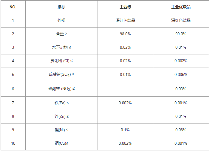 性 狀:紫紅色結晶,易潮解,溶于水、酸及乙醇,在140℃時失去四個分子結晶水。比重1.703。